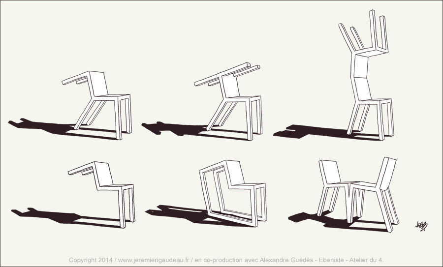 Cette Chaise clonée pose un regard et une critique sur l’utilité réelle du design fonctionnel d’aujourd’hui. Entre absurdité et esthétisme, cette création se veut décalée tant dans sa forme que dans notre propre rapport à l’objet. La conception de cette assise s’appuie ici volontairement sur une démarche de tâtonnement, similaire à un processus scientifique où la manipulation provoque fréquemment erreurs et malformations dans l’expérimentation. Le sens commun de l’objet devient donc ainsi un réel sujet d’étude. Cette approche nous apporte un questionnement sur l’évolution et les dérives de la création au sens large du terme. Elle nous renvoie à la modification de notre usage quotidien de l’objet et à notre propre perception commune.