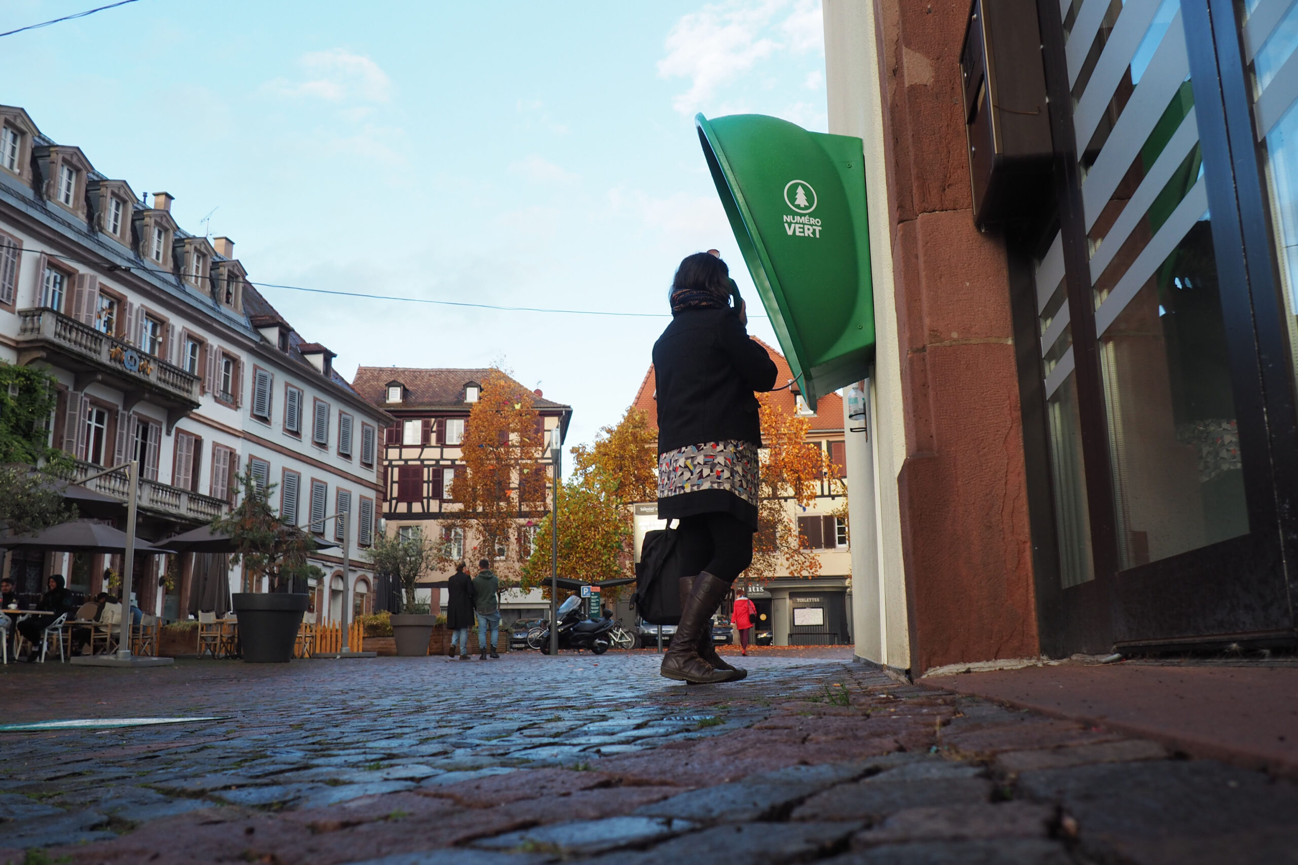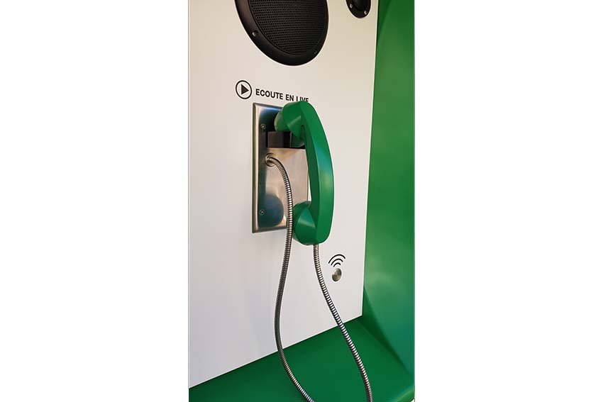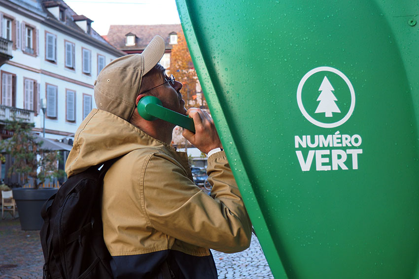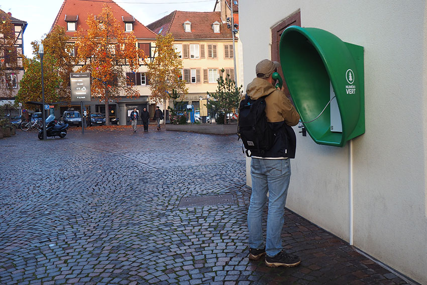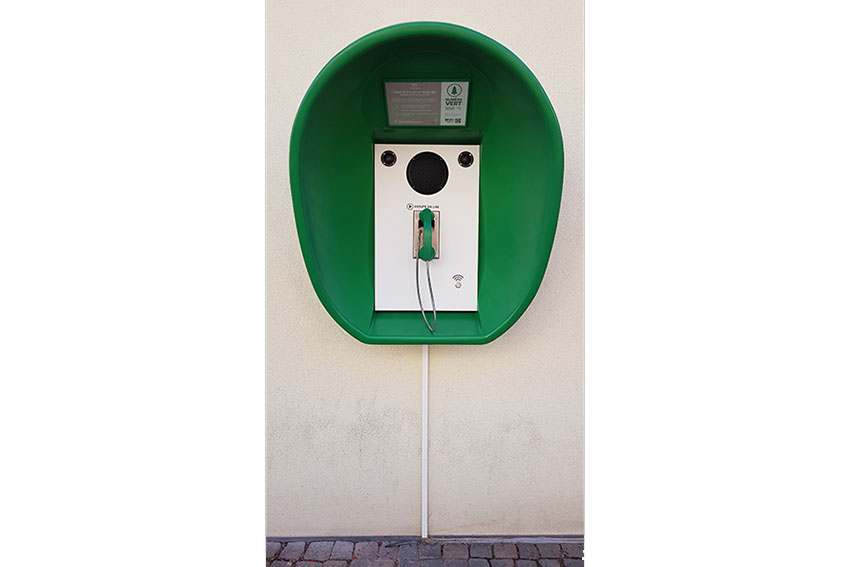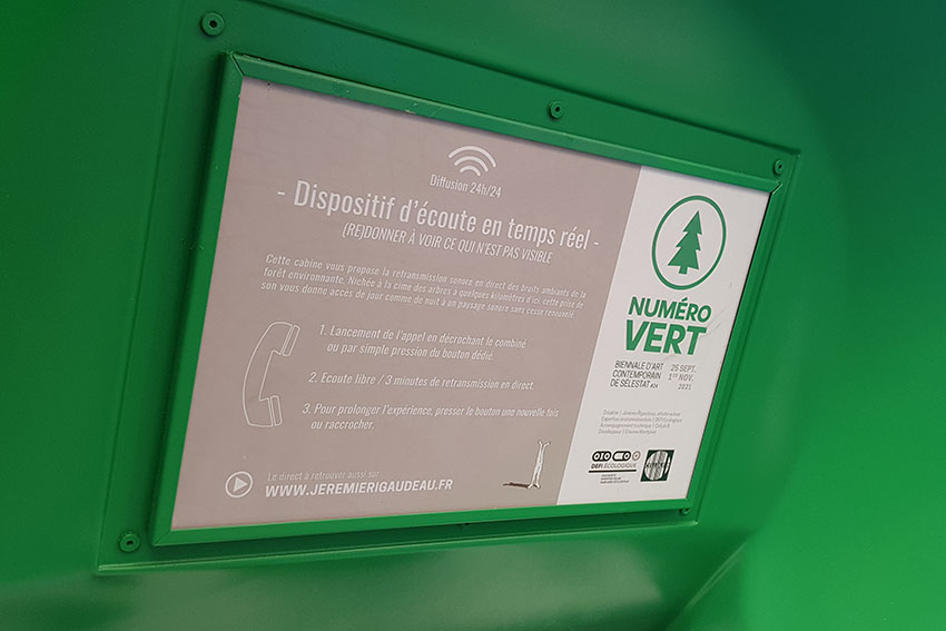Numéro vert : De cette urgence climatique soulignée par ce titre évocateur, ce projet de retransmission sonore propose de stimuler notre propre faculté d’écoute afin de s’interroger sur la place réelle de l’Homme dans ce concept dit de « Nature ». La formalisation de ce projet s’appuie sur la diffusion en direct et 24h/24 d’un paysage sonore capté à quelques kilomètres de Sélestat en plein cœur de la Forêt alsacienne. Cette retransmission sera accessible via une borne audio installée en plein cœur de la ville, borne proposant en temps réel une écoute sans cesse renouvelée tout au long de la Biennale.